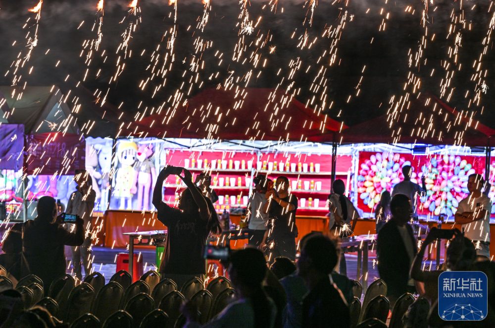 ↑ 10月5日晚,游客在貴州省晴隆縣阿妹戚托小鎮(zhèn)觀看焰火表演。新華社記者 楊文斌 攝
