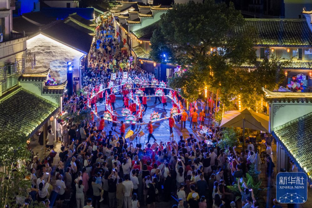 ↑ 10月5日,游客在浙江省浦江縣東街歷史文化街區(qū)欣賞板凳龍巡游(無人機(jī)照片)。新華社發(fā)(張輝攝)