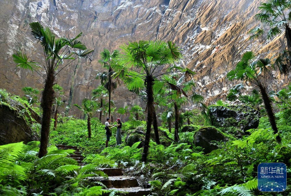 ↑ 10月6日,游客在湖北省宣恩縣矅天眼景區(qū)深達(dá)290余米的鑼圈巖天坑底部觀光游玩。新華社發(fā)(宋文攝)
