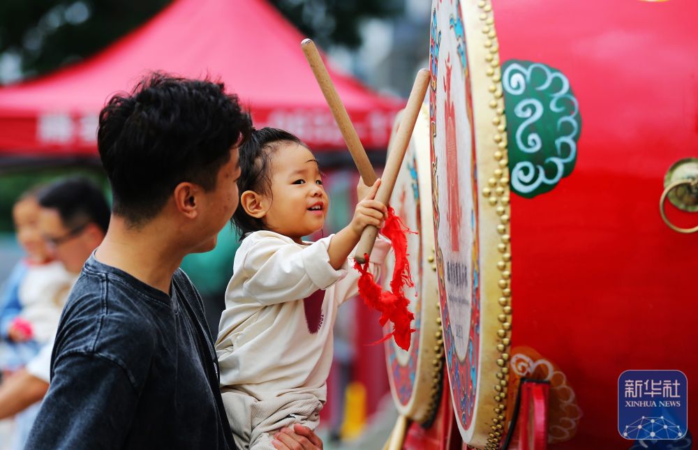 ↑ 10月6日,在山東省滕州漢畫像石館門外,家長陪著孩子體驗(yàn)擊鼓。新華社發(fā)(李志軍攝)