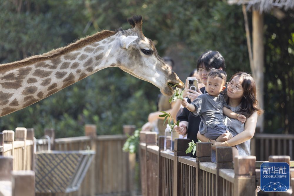 ↑ 10月6日,小朋友在上海野生動(dòng)物園與長頸鹿互動(dòng)。新華社記者 王翔 攝