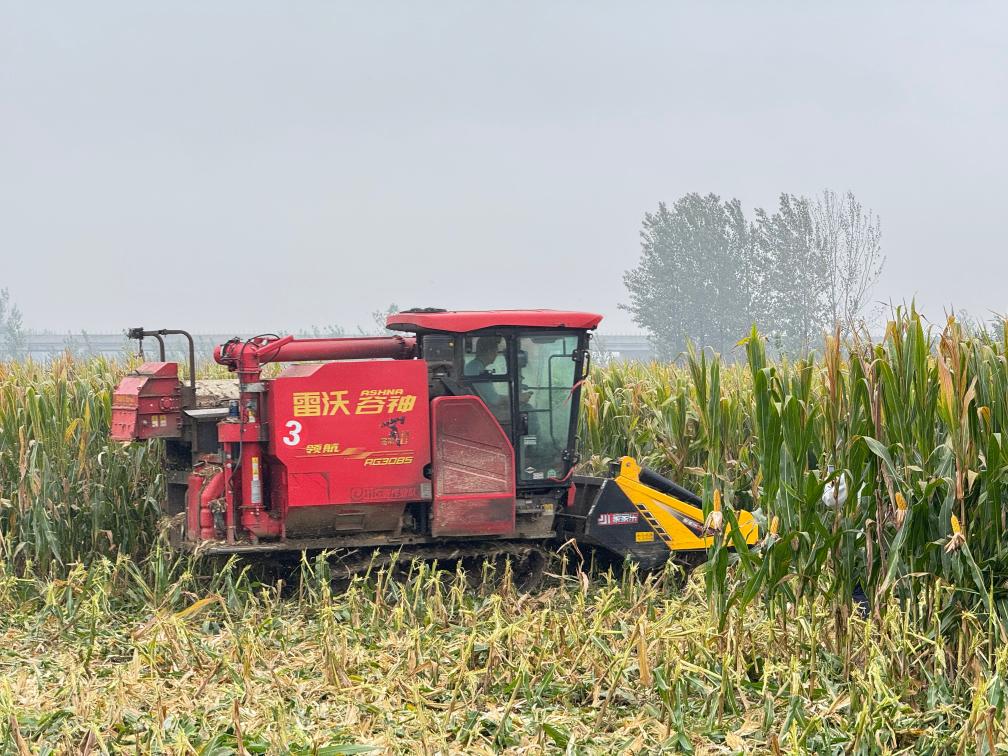 2025年10月11日,在安徽省淮北市濉溪縣百善鎮(zhèn)張莊村,從河南駐馬店調(diào)運(yùn)過來的履帶式收割機(jī)在收割玉米。新華社發(fā)(徐弘揚(yáng) 攝)