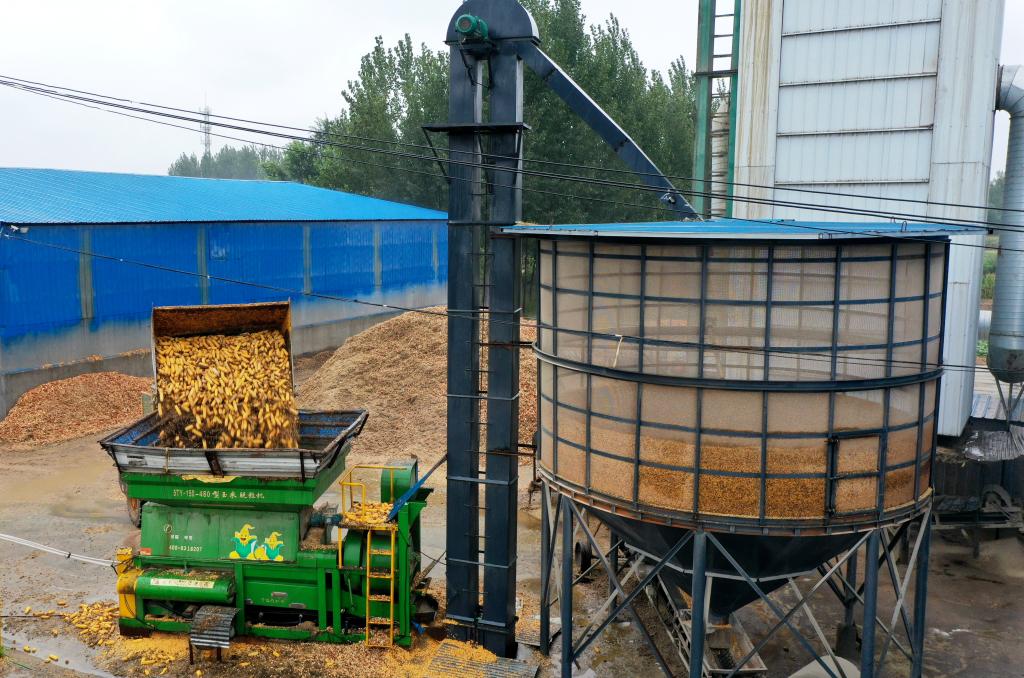 2025年10月10日拍攝的河北省衡水市阜城縣古城鎮(zhèn)一家糧食烘干企業(yè)作業(yè)現(xiàn)場(chǎng)(無人機(jī)照片)。新華社發(fā)(崔賢飛 攝)