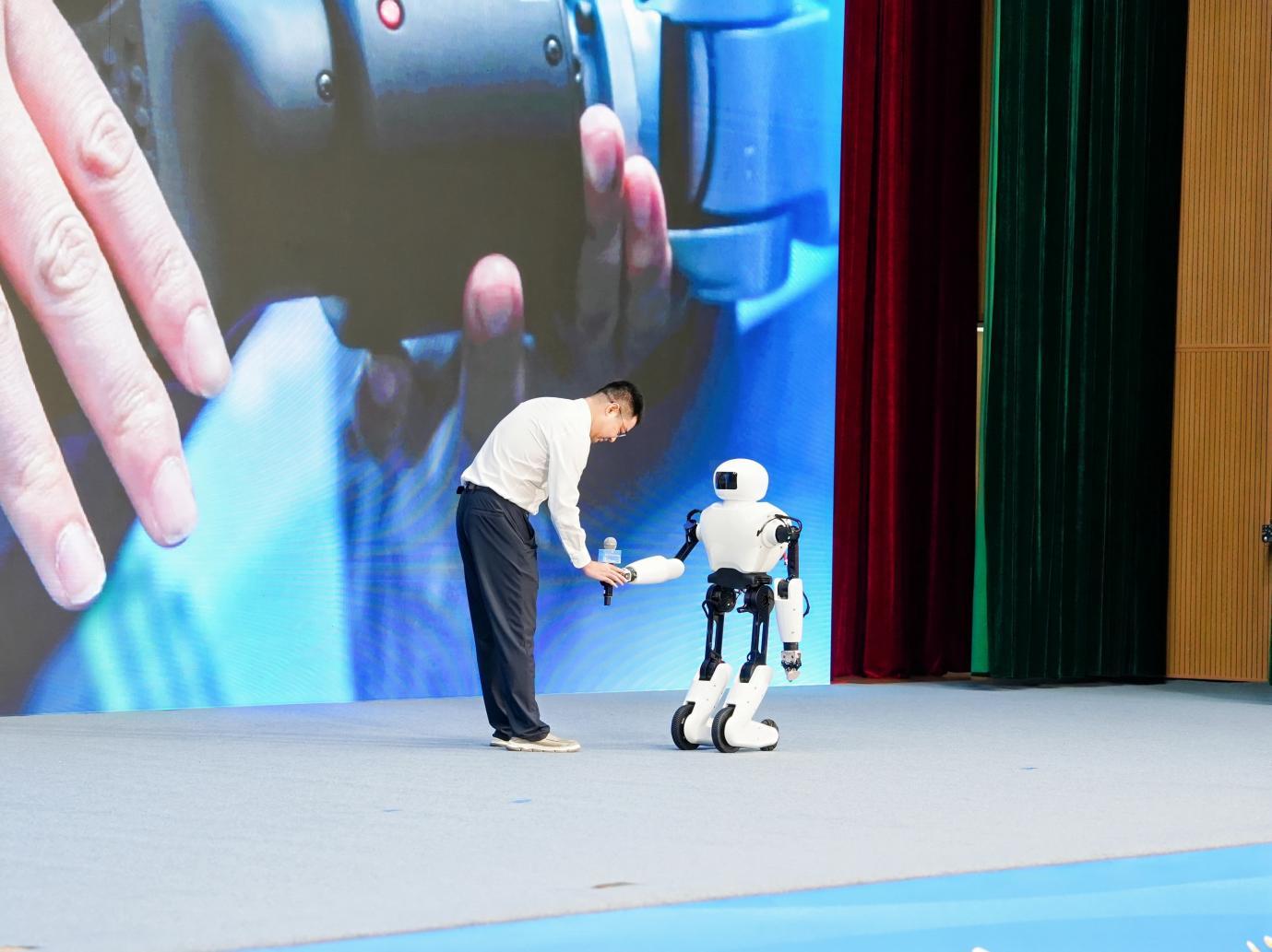 “荊楚”人形機(jī)器人遞上話筒。