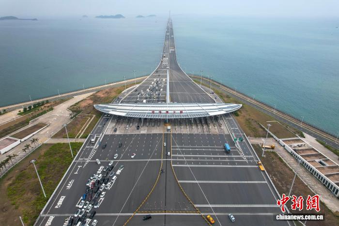 2024年3月30日,廣東珠海,港澳車(chē)輛經(jīng)港珠澳大橋珠海公路口岸入境。(無(wú)人機(jī)照片) 中新社記者 陳驥旻 攝