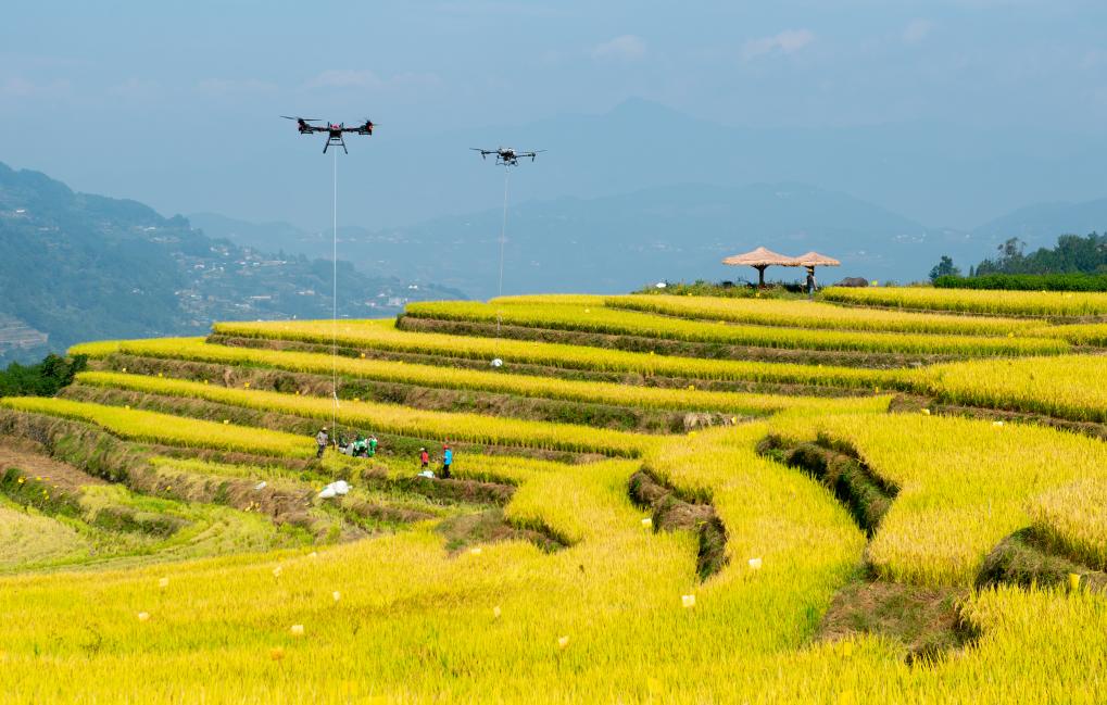 10月10日,湖北省秭歸縣沙鎮(zhèn)溪鎮(zhèn)長(zhǎng)春村村民用無(wú)人機(jī)轉(zhuǎn)運(yùn)收獲的水稻(無(wú)人機(jī)照片)。新華社發(fā)(雷勇攝)