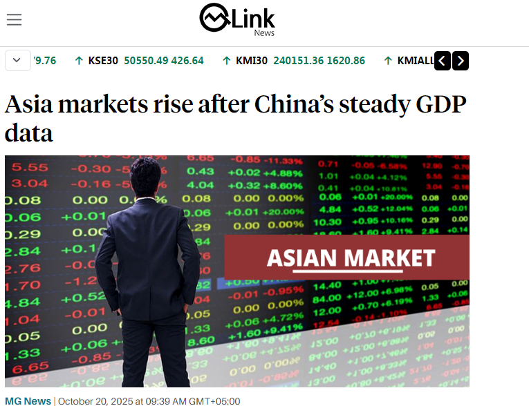 巴基斯坦金融網站Mettis Global Link發(fā)表題為《亞洲股市響應中國穩(wěn)健GDP數據普漲》的文章。文章分析稱,亞洲市場20日迎來開門紅,得益于中國的最新經濟數據。中國第三季度GDP同比增長4.8%,同時維持貸款市場報價利率(LPR)。股市方面,香港恒生指數大漲逾2%,內地滬深300指數上漲0.74%。日經225指數飆升近3%,首次突破49000點大關,東證指數上漲2%。