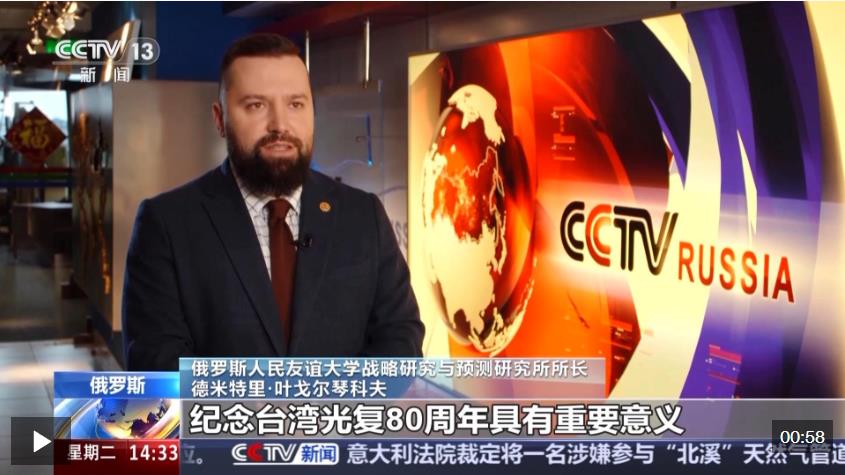 俄羅斯人民友誼大學(xué)戰(zhàn)略研究與預(yù)測(cè)研究所所長(zhǎng) 德米特里·葉戈?duì)柷倏品颍杭o(jì)念臺(tái)灣光復(fù)80周年具有重要意義,象征著中國(guó)人民心向統(tǒng)一。戰(zhàn)勝日本軍國(guó)主義是世界反法西斯戰(zhàn)爭(zhēng)的重要組成部分,這一歷史應(yīng)該被銘記。