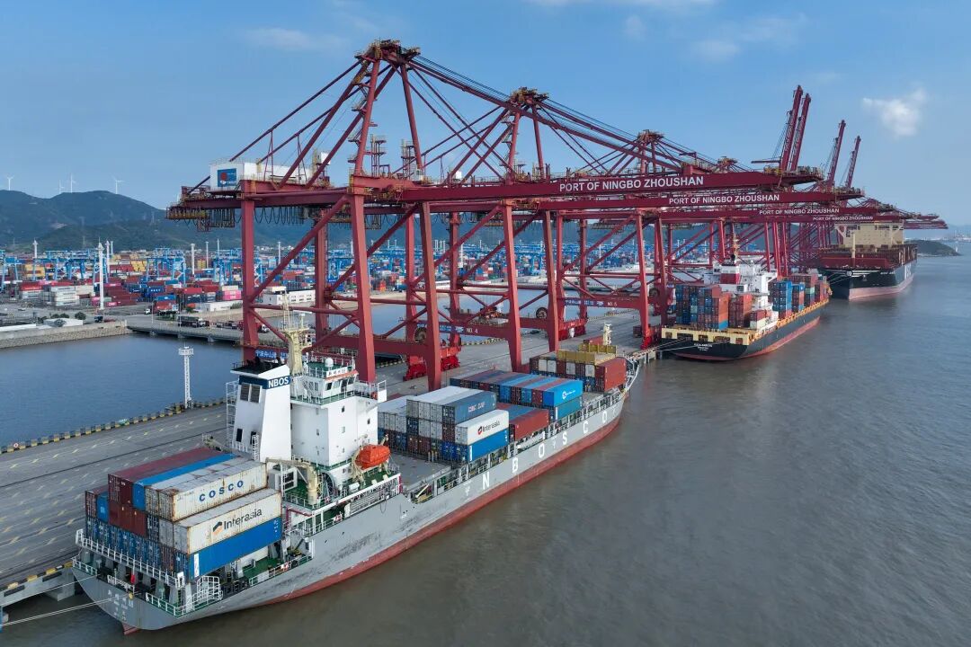 在寧波舟山港金塘港區(qū)大浦口集裝箱碼頭,船舶進(jìn)行集裝箱裝卸作業(yè)。新華社發(fā)(鄒訓(xùn)永攝)