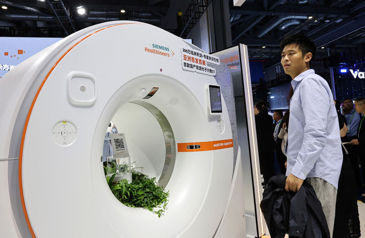 2025年11月6日,參觀者在進博會西門子公司展臺一個CT機展品旁駐足觀看,這是西門子公司首款國產雙源光子計數(shù)CT,也是該產品亞洲首發(fā)首展。新華社記者 方喆 攝