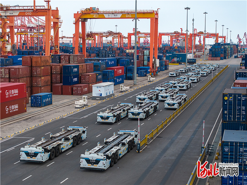 近日,唐山港京唐港區(qū),集裝箱碼頭堆場(chǎng)上智能平板運(yùn)輸車整裝待發(fā)。 河北日?qǐng)?bào)記者趙杰攝