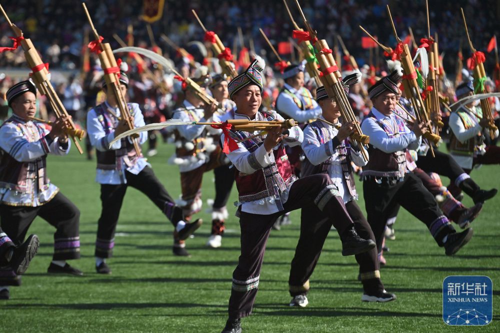 ↑11月29日,表演者在融水縣民族體育公園舉行的蘆笙斗馬節(jié)開幕式現(xiàn)場(chǎng)吹奏蘆笙。新華社記者 黃孝邦 攝