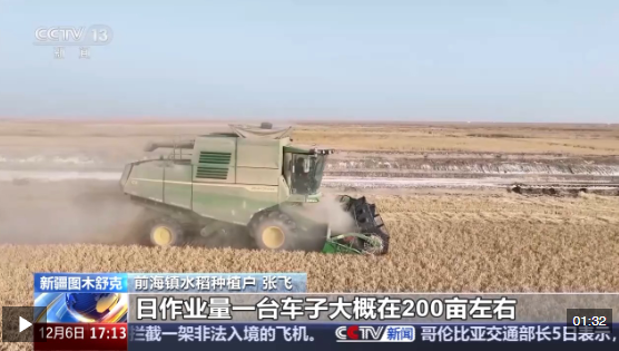 前海鎮(zhèn)水稻種植戶 張飛:一臺車子日作業(yè)量在200畝左右,4000畝水稻大概在10天到15天之內(nèi)能采收完畢。