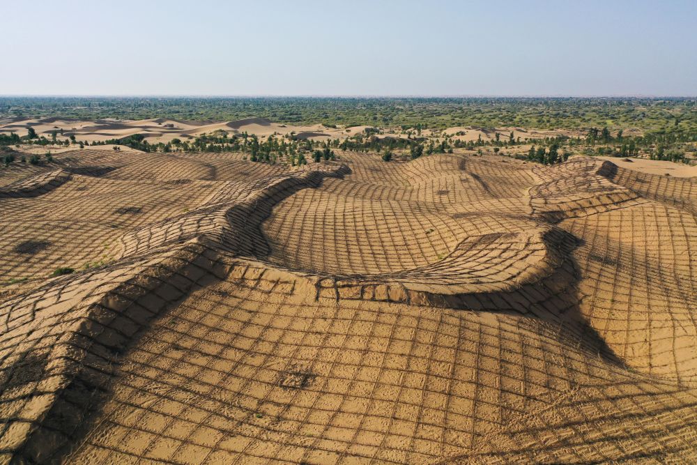 這是2025年9月12日在內(nèi)蒙古鄂爾多斯市拍攝的正在治理中的庫(kù)布其沙漠(無(wú)人機(jī)照片)。新華社記者 李志鵬 攝