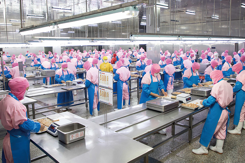 走進禾豐旗下的沈陽華康新新食品有限公司,一只只屠宰后的“禾豐雞”被送入食品加工車間,經(jīng)過分割、切塊、烤制等一系列工序,各類雞肉熟食源源不斷下線,打包發(fā)往韓國。