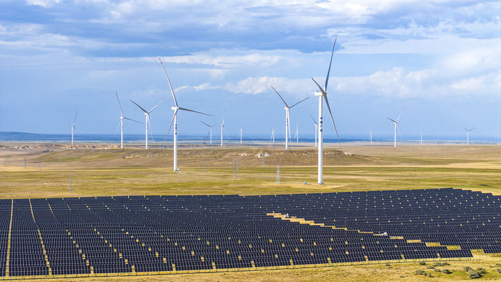 在新疆阿勒泰地區(qū)吉木乃縣拍攝的50萬(wàn)千瓦時(shí)風(fēng)電項(xiàng)目配套輸電線路建設(shè)現(xiàn)場(chǎng)(2025年7月1日攝,無(wú)人機(jī)照片)。新華社發(fā)(努爾別克·努爾曼 攝)