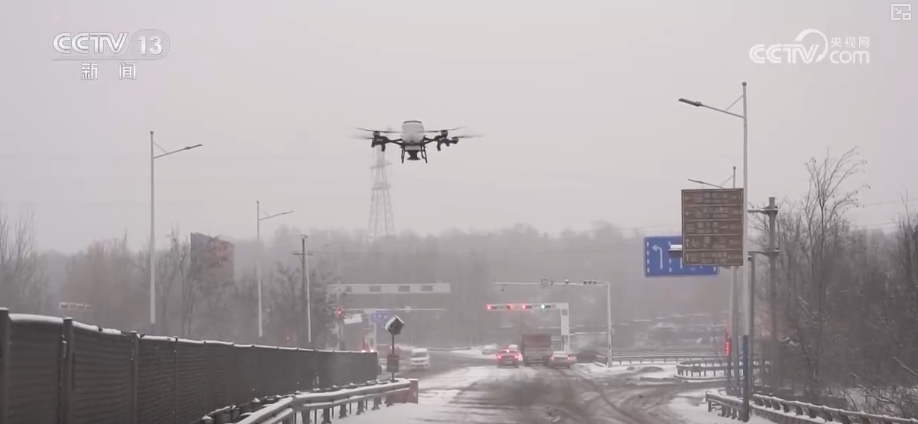 降雪致交通受阻 無(wú)人機(jī)大型機(jī)械撒鹽除雪