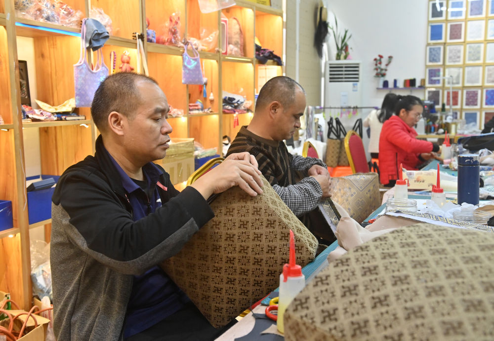 在廣西賓陽壯錦文創(chuàng)館,工人制作壯錦文創(chuàng)產(chǎn)品。廣西賓陽縣有著悠久的壯錦生產(chǎn)歷史。近年來,該縣在傳統(tǒng)壯錦生產(chǎn)的基礎(chǔ)上,積極推動壯錦文創(chuàng)產(chǎn)業(yè)發(fā)展,拓寬了當(dāng)?shù)貏趧泳蜆I(yè)渠道。新華社記者 陸波岸 攝