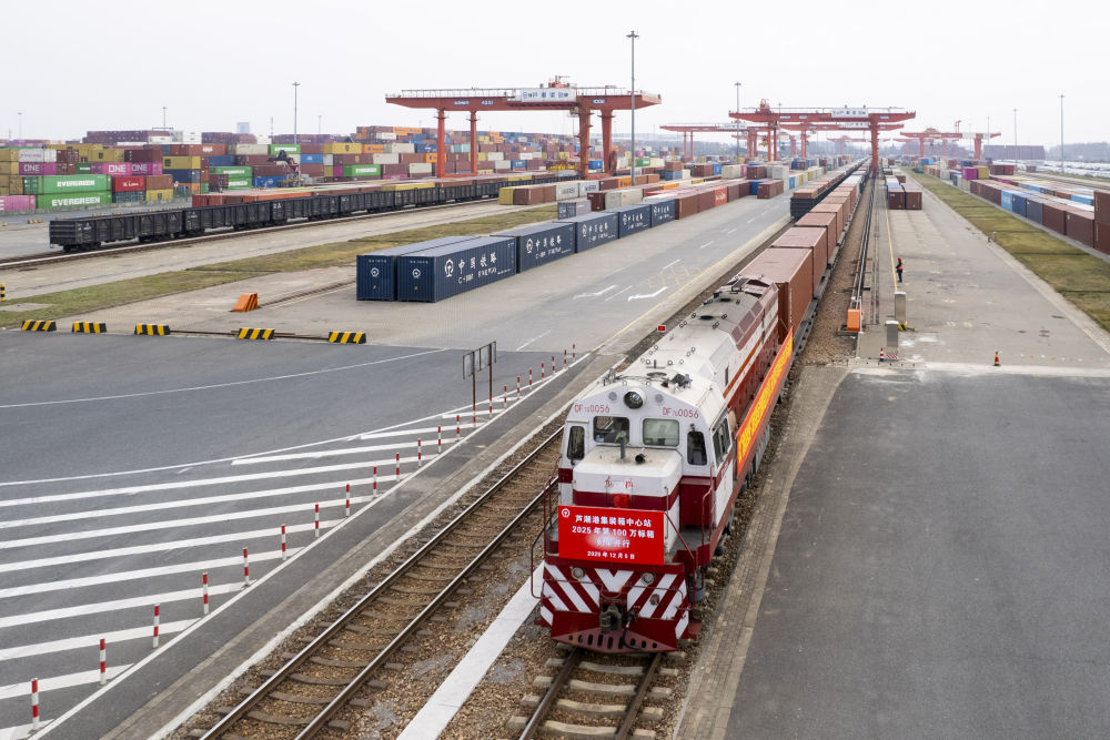 2025年12月5日拍攝的上海鐵路蘆潮港集裝箱中心站(無人機照片)。當(dāng)日上午,一趟載有太陽能光伏組件、汽車零配件等貨物的海鐵聯(lián)運班列緩緩從上海蘆潮港集裝箱中心站開出,上海海鐵聯(lián)運年度業(yè)務(wù)量首次跨越百萬標(biāo)箱大關(guān)。新華社記者 王翔 攝