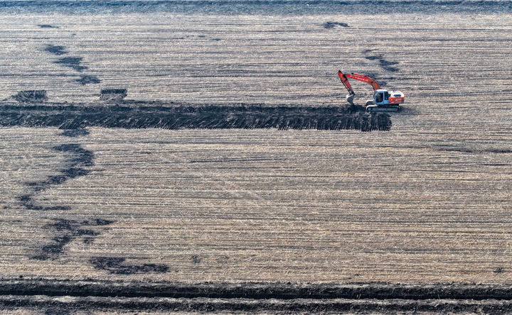 2025年3月11日,在天津市津南區(qū)八里臺鎮(zhèn)大韓莊村,工人駕駛挖掘機進行高標(biāo)準(zhǔn)農(nóng)田施工作業(yè)(無人機照片)。