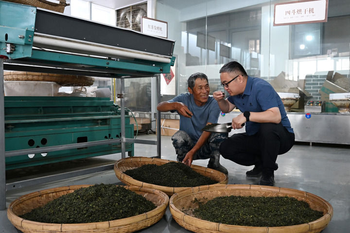 2025年5月25日,在山東省日照市五蓮縣丁家樓子村,第一書記鄭勇山(右)在村里的茶葉合作社查看茶葉品質(zhì)。