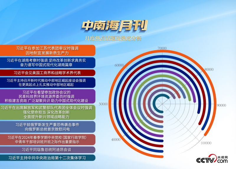 央視網(wǎng)“智聞”系統(tǒng)提取分析2024年3月全網(wǎng)時政新聞熱點顯示,“習近平總書記在湖南考察”“新時代推動中部地區(qū)崛起座談會”等相關話題備受關注。