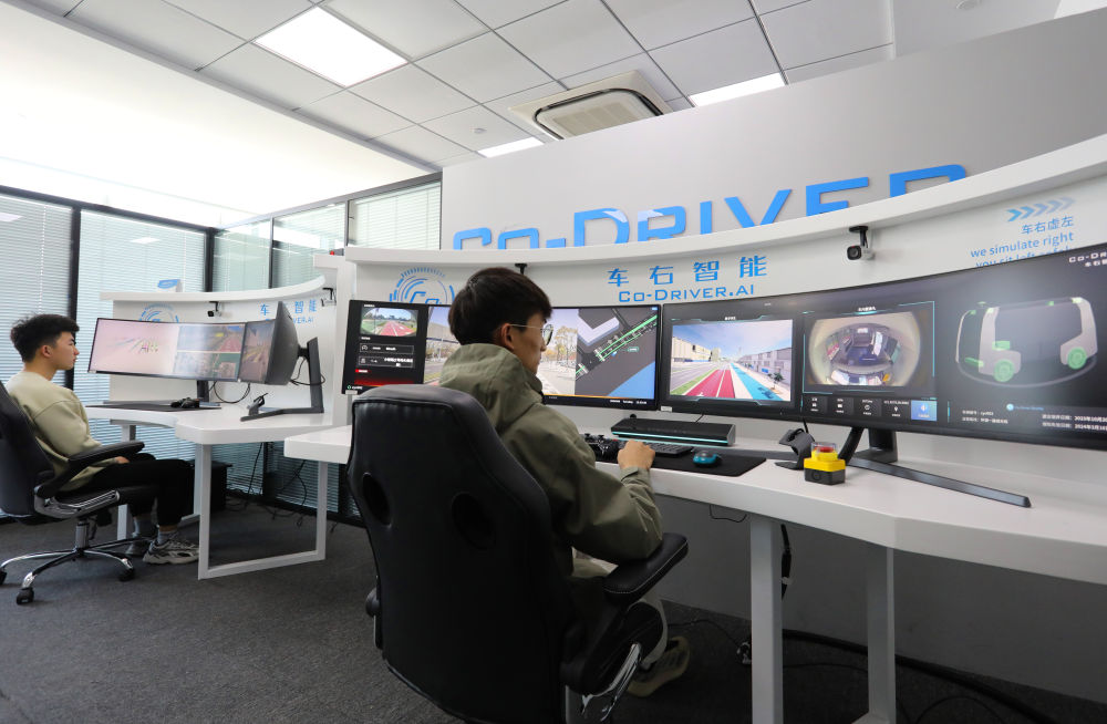 在位于中國(上海)自由貿(mào)易試驗(yàn)區(qū)臨港新片區(qū)的一家智能駕駛企業(yè),工作人員通過無人駕駛汽車遠(yuǎn)程監(jiān)管平臺的實(shí)時(shí)畫面,結(jié)合電子地圖對在自動駕駛測試專用路上行駛的車輛進(jìn)行監(jiān)管(2024年4月9日攝)。