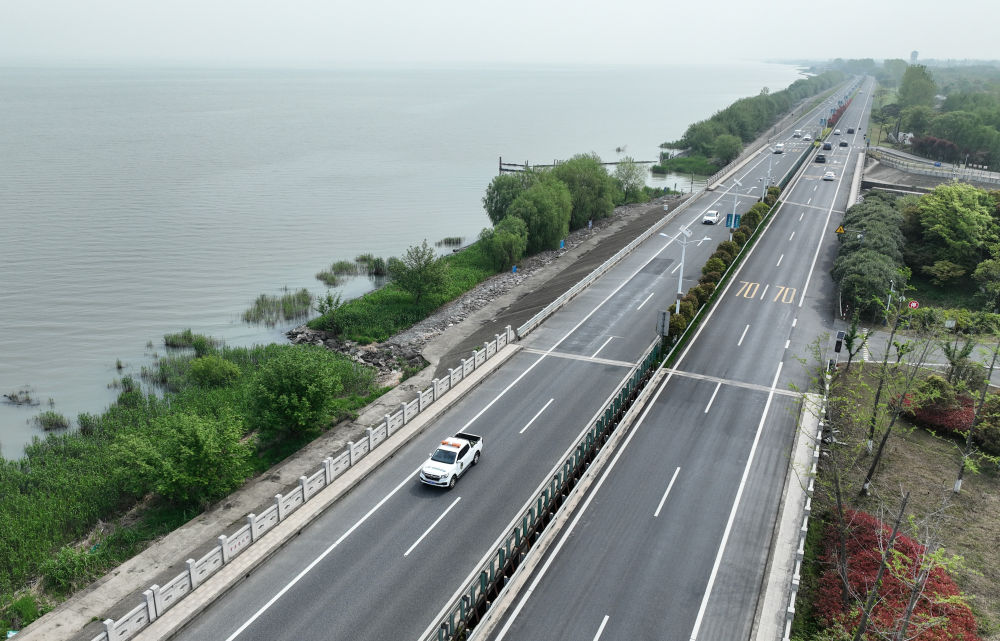 2024年4月11日,浙江省湖州市吳興區(qū)綜合行政執(zhí)法局高新區(qū)中隊(duì)執(zhí)法人員駕車在太湖沿岸巡查 (無人機(jī)照片)。