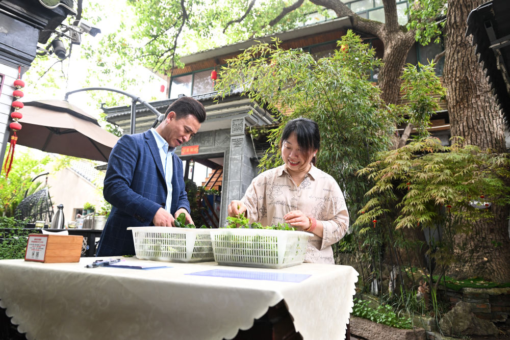 2024年4月11日,在江蘇省蘇州市吳中區(qū)金庭鎮(zhèn),退捕漁民沈雪榮和妻子沈燕燕在自家經(jīng)營的農(nóng)家樂“美味漁家蟹園”擇菜。“退捕后,太湖的生態(tài)環(huán)境越來越好,游客越來越多,我們家的農(nóng)家樂生意也越來越紅火?!鄙蜓s感慨道。