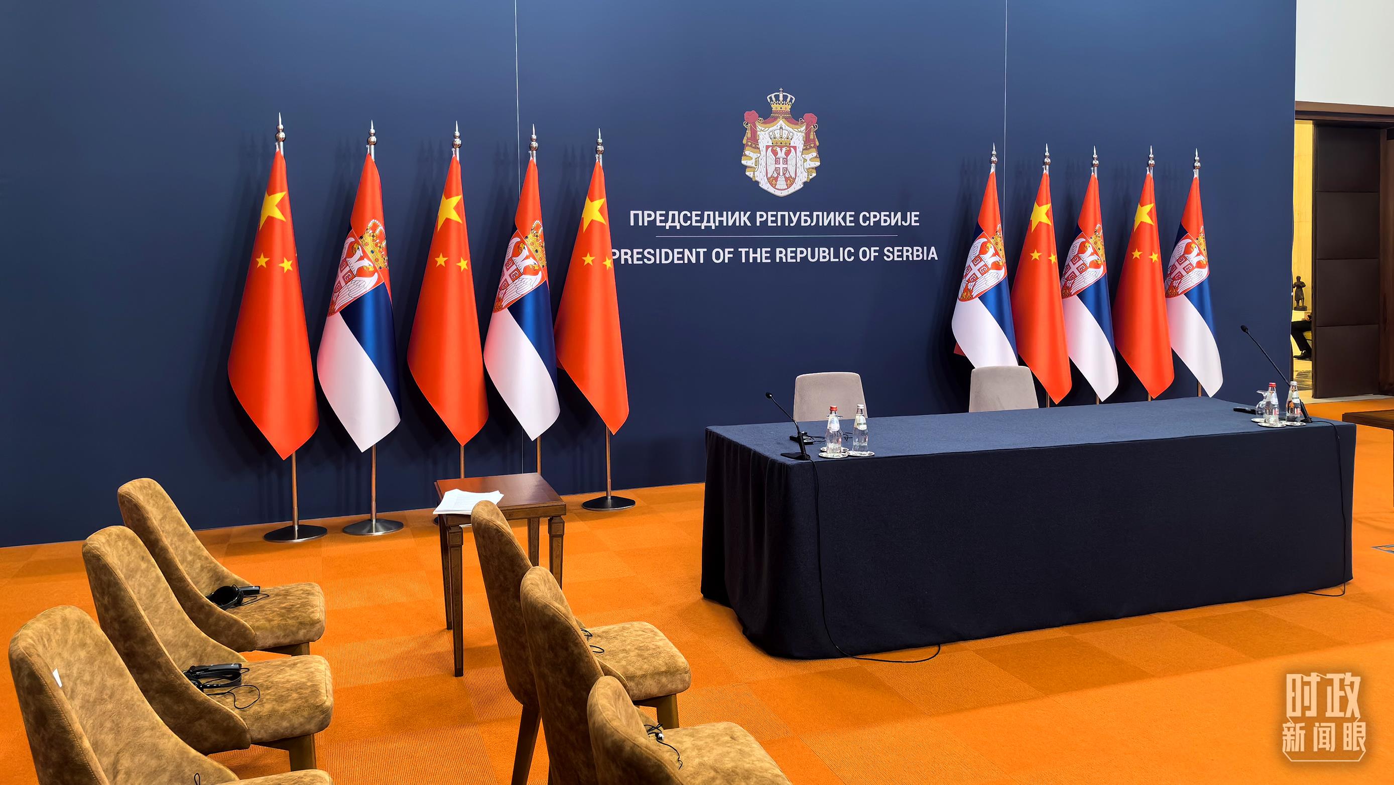 習主席同武契奇總統(tǒng)會談后共同會見記者,這是會見開始前的現(xiàn)場。(總臺央視記者鄂介甫拍攝)
