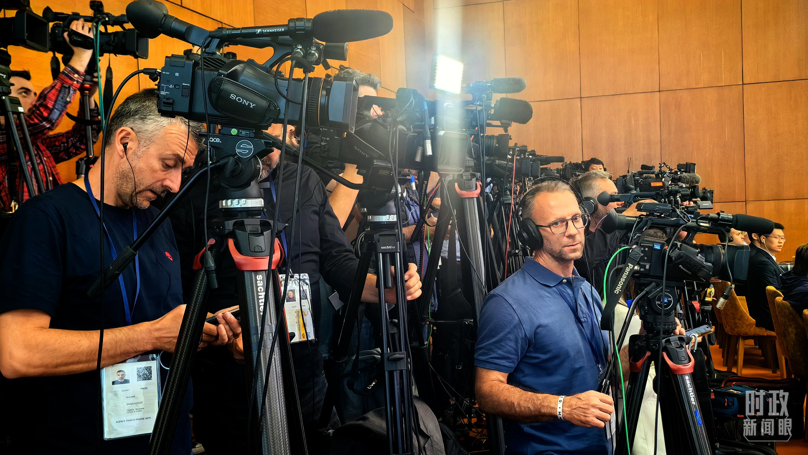 習主席同武契奇總統(tǒng)會談后共同會見記者,會見現(xiàn)場記者云集。(總臺央視記者荊偉拍攝)