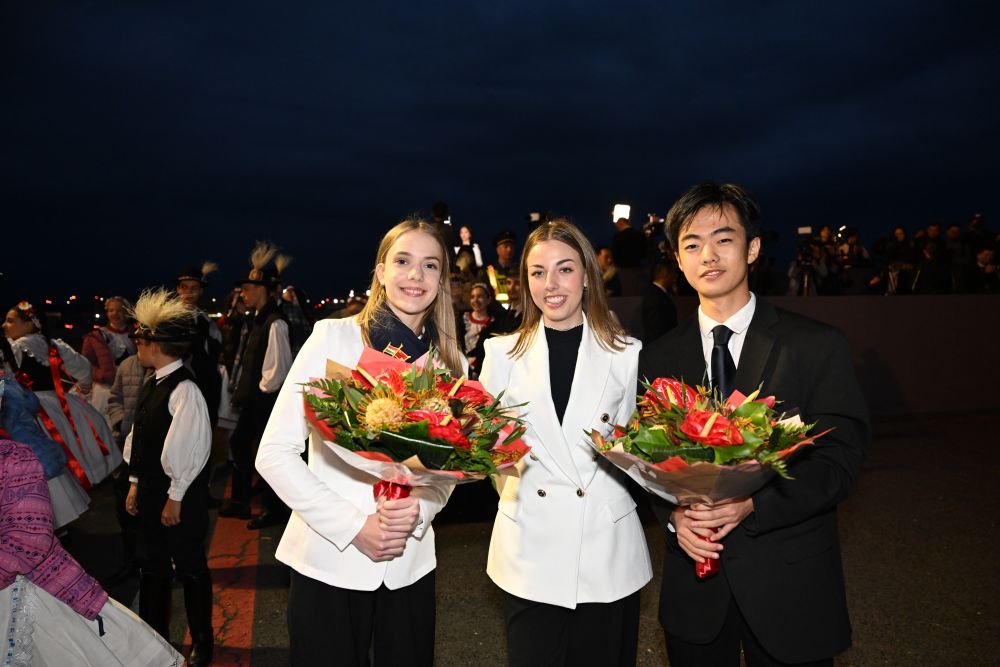 當(dāng)?shù)貢r(shí)間5月8日晚,在匈牙利布達(dá)佩斯國(guó)際機(jī)場(chǎng),匈牙利姑娘歐拉·塔瑪拉與匈中雙語(yǔ)學(xué)校兩名參加歡迎儀式的學(xué)生合影。新華社記者謝環(huán)馳攝
