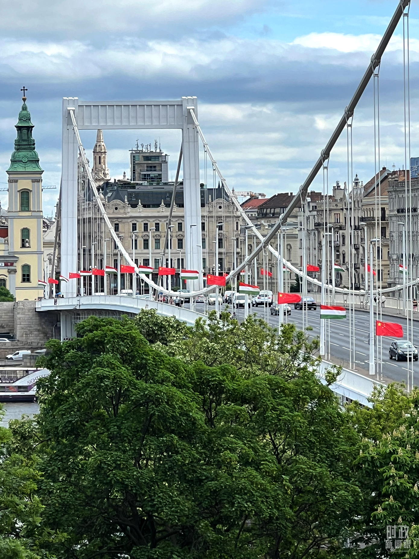 懸掛中匈兩國國旗的布達(dá)佩斯伊麗莎白大橋。(總臺(tái)央視記者石偉明拍攝)
