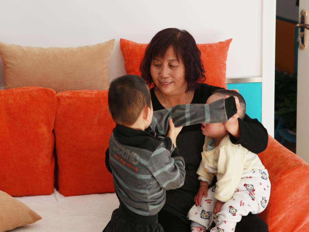 2017年11月3日,內蒙古呼和浩特市兒童福利院里,“愛心媽媽”景鳳英抱著兩個孩子。新華社記者 王婧嬙 攝
