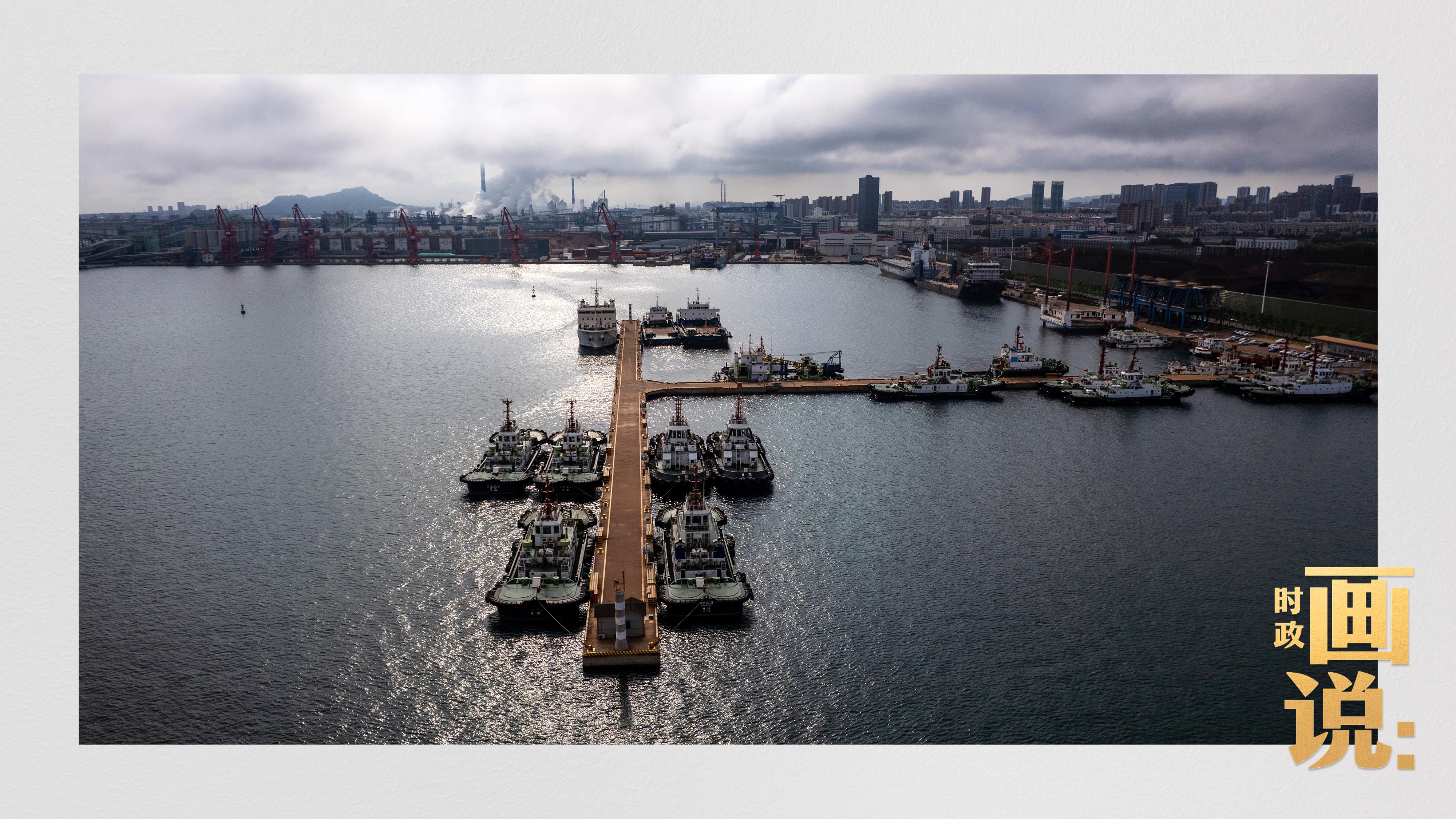 △陽光穿越云層,灑落在港區(qū)內(nèi)待命的拖船碼頭。