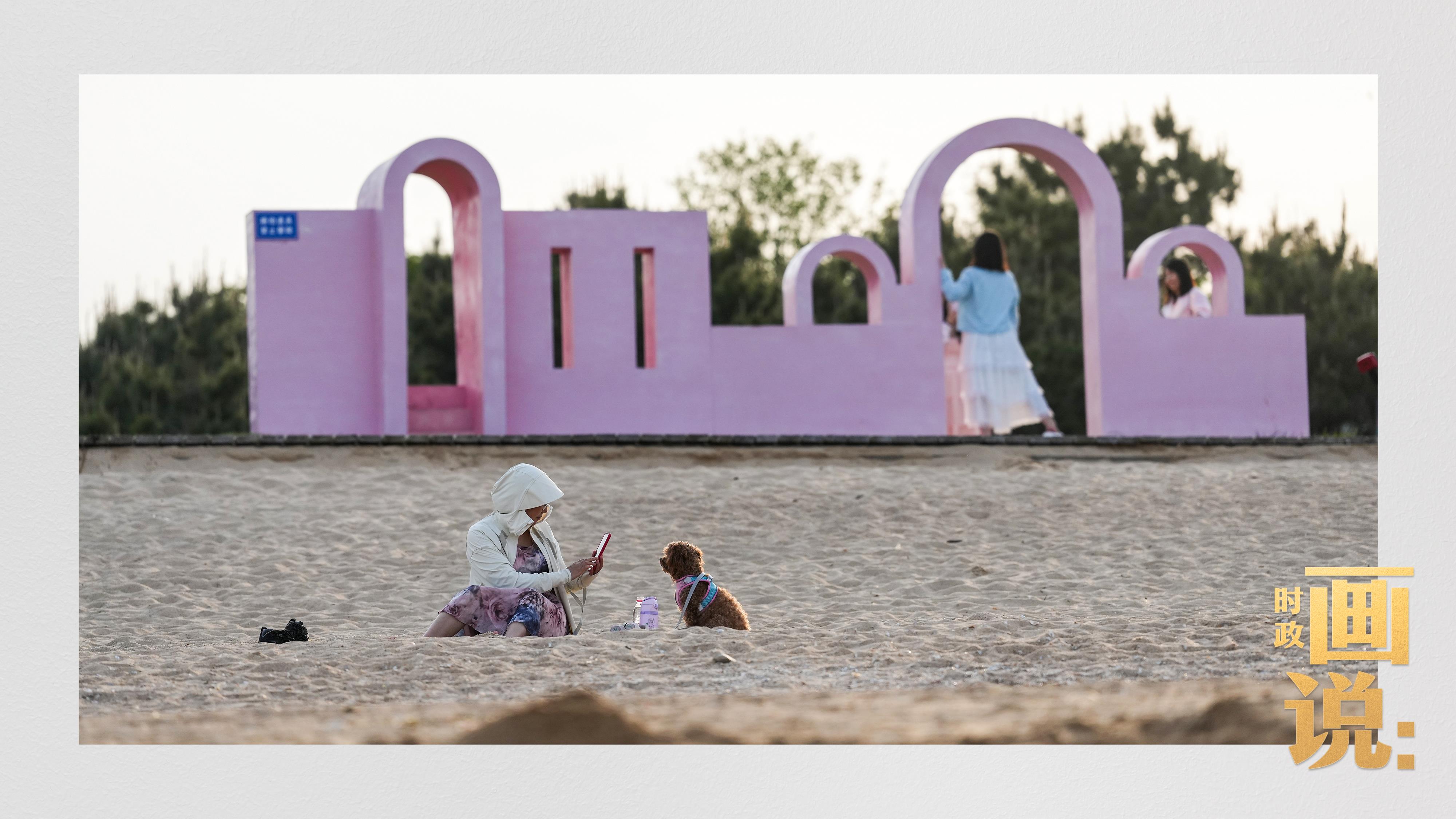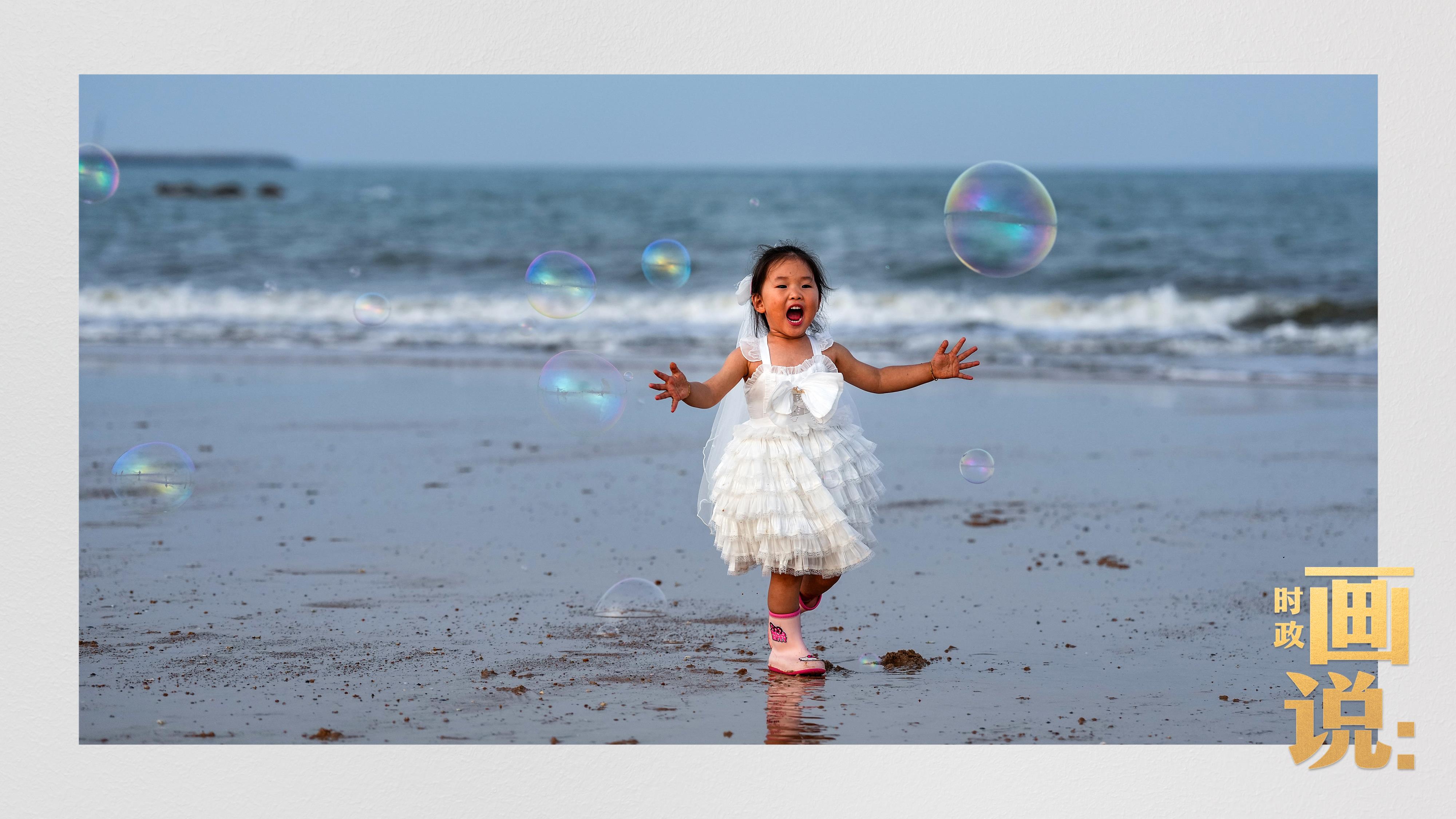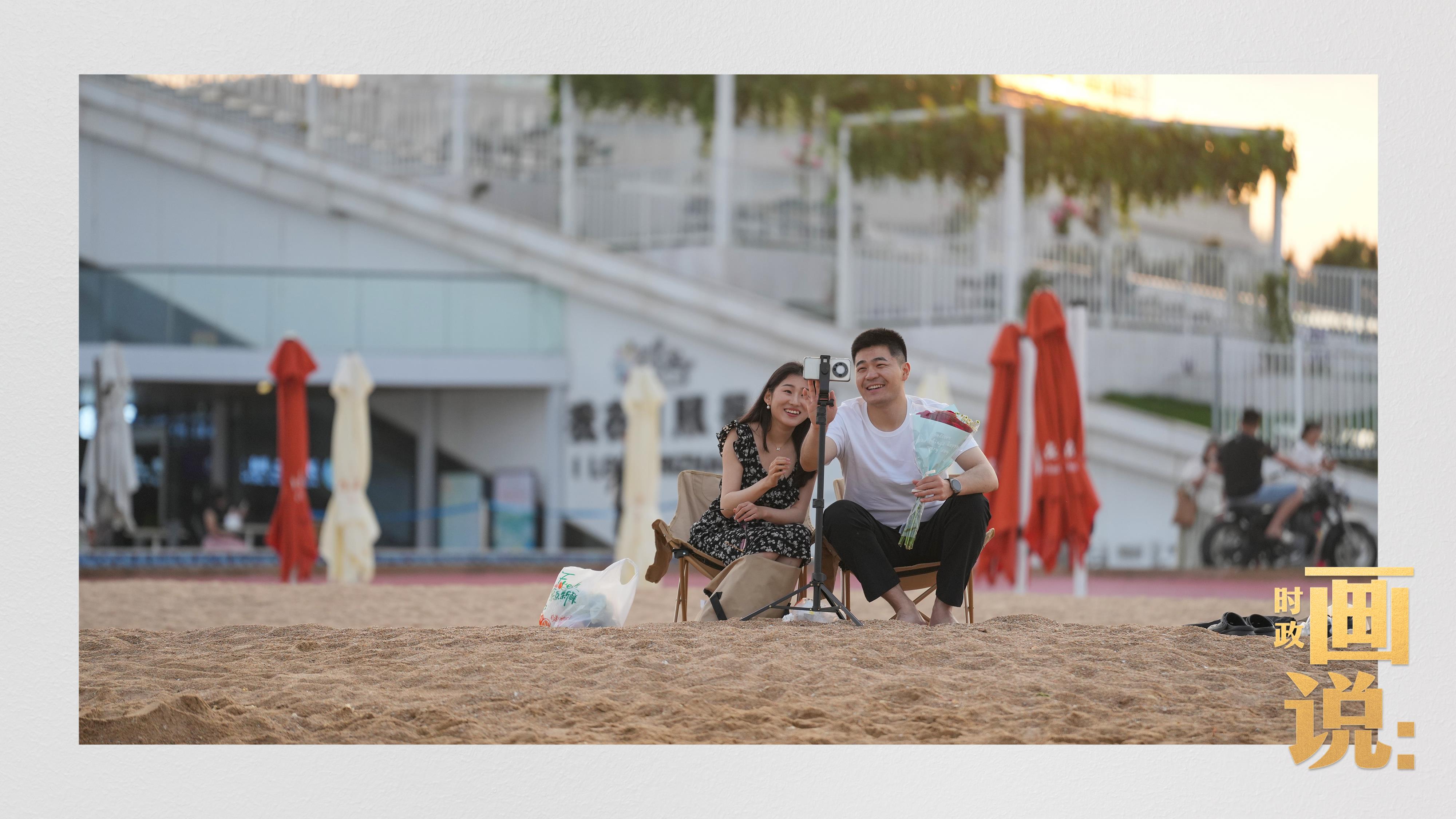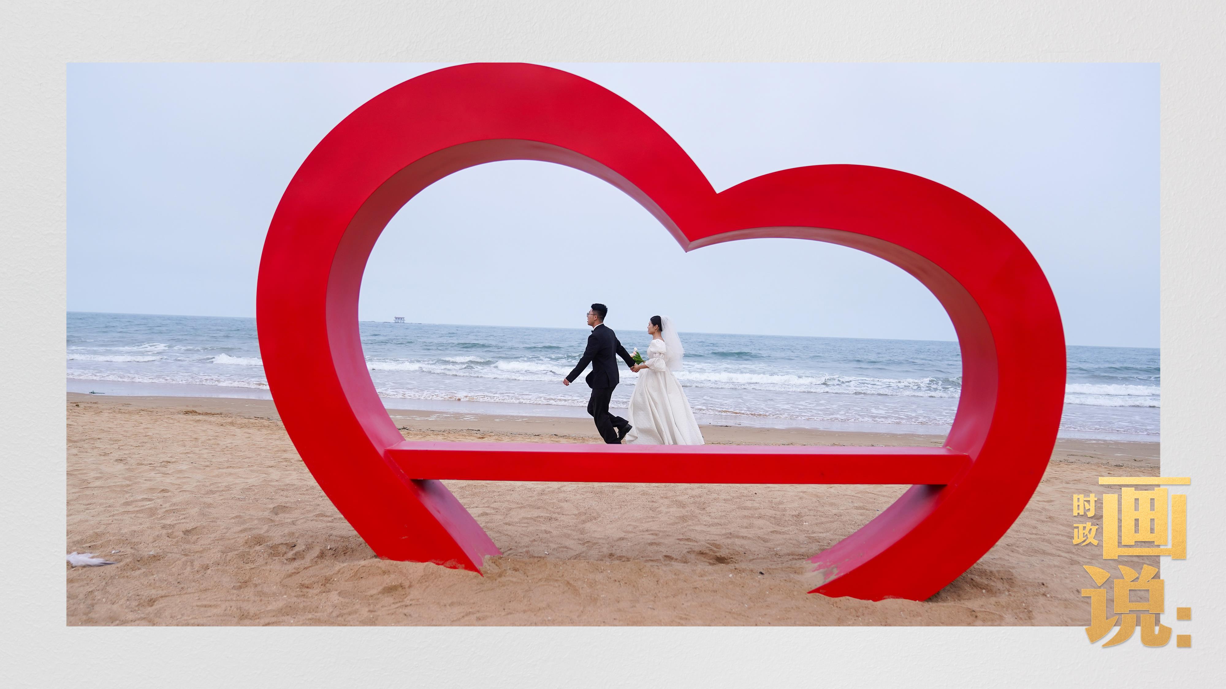 △日照陽光海岸綠道上的萬平口景區(qū),一對(duì)游客在海浪中翩然起舞。