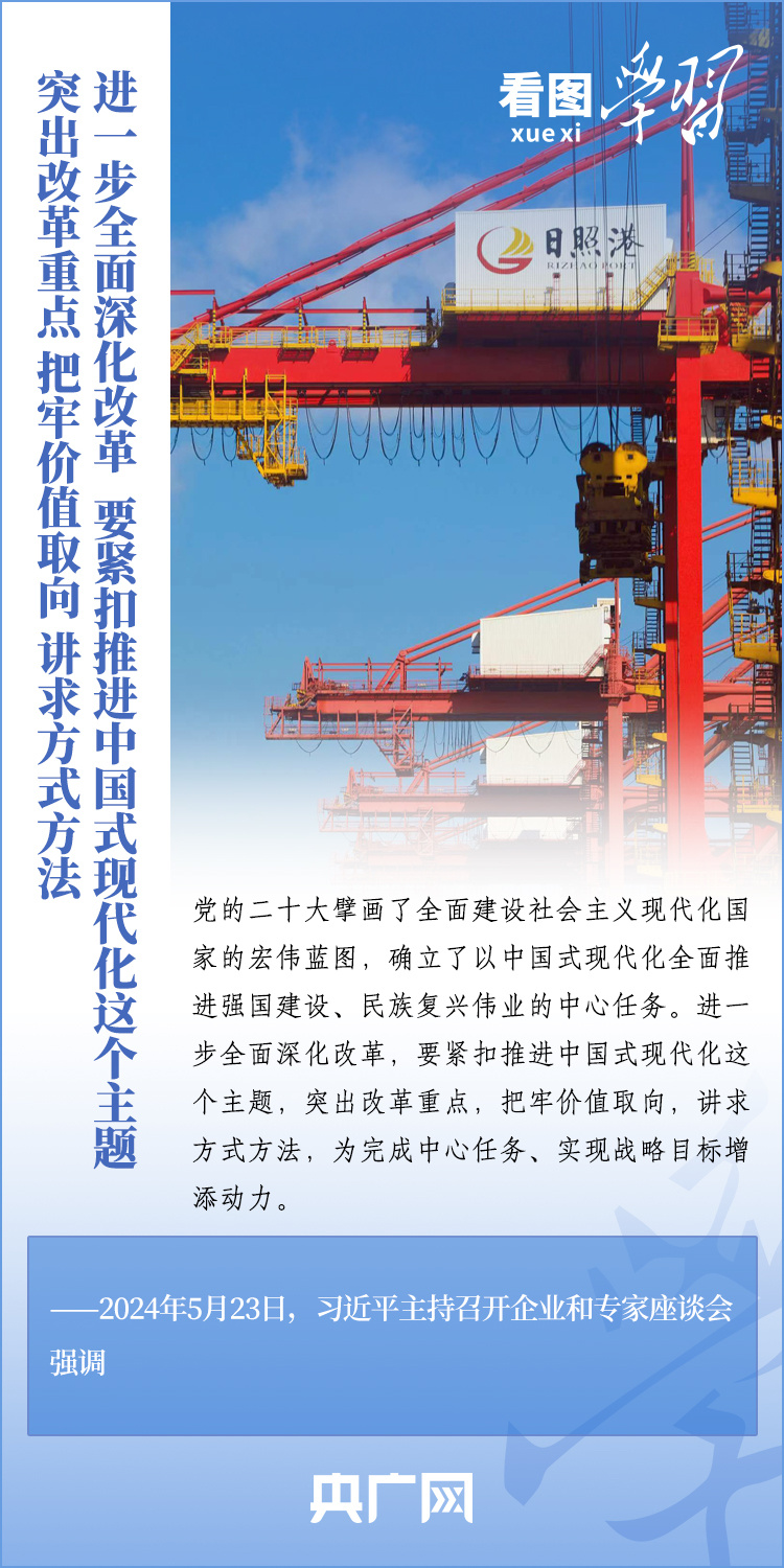 改革是發(fā)展的動(dòng)力。5月23日,習(xí)近平總書(shū)記在山東濟(jì)南主持召開(kāi)企業(yè)和專(zhuān)家座談會(huì)并發(fā)表重要講話(huà)??倳?shū)記強(qiáng)調(diào),進(jìn)一步全面深化改革,要緊扣推進(jìn)中國(guó)式現(xiàn)代化這個(gè)主題,突出改革重點(diǎn),把牢價(jià)值取向,講求方式方法,為完成中心任務(wù)、實(shí)現(xiàn)戰(zhàn)略目標(biāo)增添動(dòng)力。一起來(lái)學(xué)習(xí)!