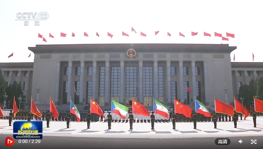 奧比昂抵達(dá)時,禮兵列隊致敬。兩國元首登上檢閱臺,軍樂團奏中赤幾兩國國歌,天安門廣場鳴放21響禮炮。奧比昂在習(xí)近平陪同下檢閱中國人民解放軍儀仗隊,并觀看分列式。