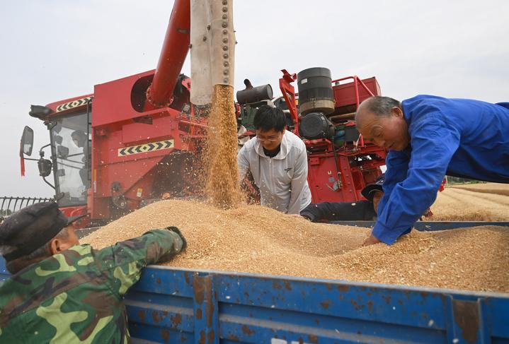 麥?zhǔn)諘r(shí)節(jié),在安徽阜陽(yáng)太和縣,機(jī)器轟鳴,麥浪翻滾如金色綢緞,飽滿(mǎn)的麥粒裝滿(mǎn)一輛輛運(yùn)糧車(chē)的貨廂。