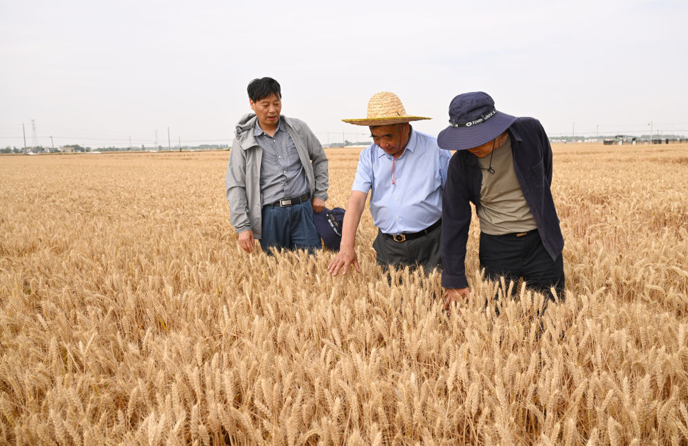 2024年5月29日,在太和縣淙祥現(xiàn)代農(nóng)業(yè)種植專(zhuān)業(yè)合作社,徐淙祥(中)和農(nóng)技專(zhuān)家一起為試驗(yàn)麥種測(cè)產(chǎn)。