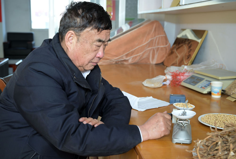 2023年2月21日,在太和縣淙祥現(xiàn)代農(nóng)業(yè)種植專(zhuān)業(yè)合作社,徐淙祥在實(shí)驗(yàn)室里對(duì)農(nóng)作物樣品進(jìn)行稱(chēng)重和記錄。