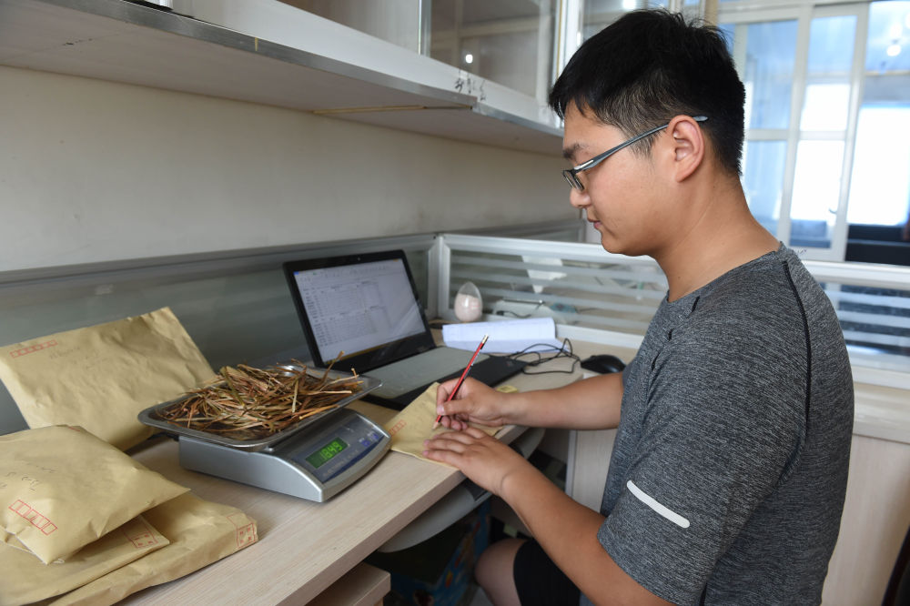 2022年6月28日,在太和縣淙祥現(xiàn)代農(nóng)業(yè)種植專(zhuān)業(yè)合作社,徐旭東在實(shí)驗(yàn)室對(duì)農(nóng)作物樣品進(jìn)行稱(chēng)重和記錄。