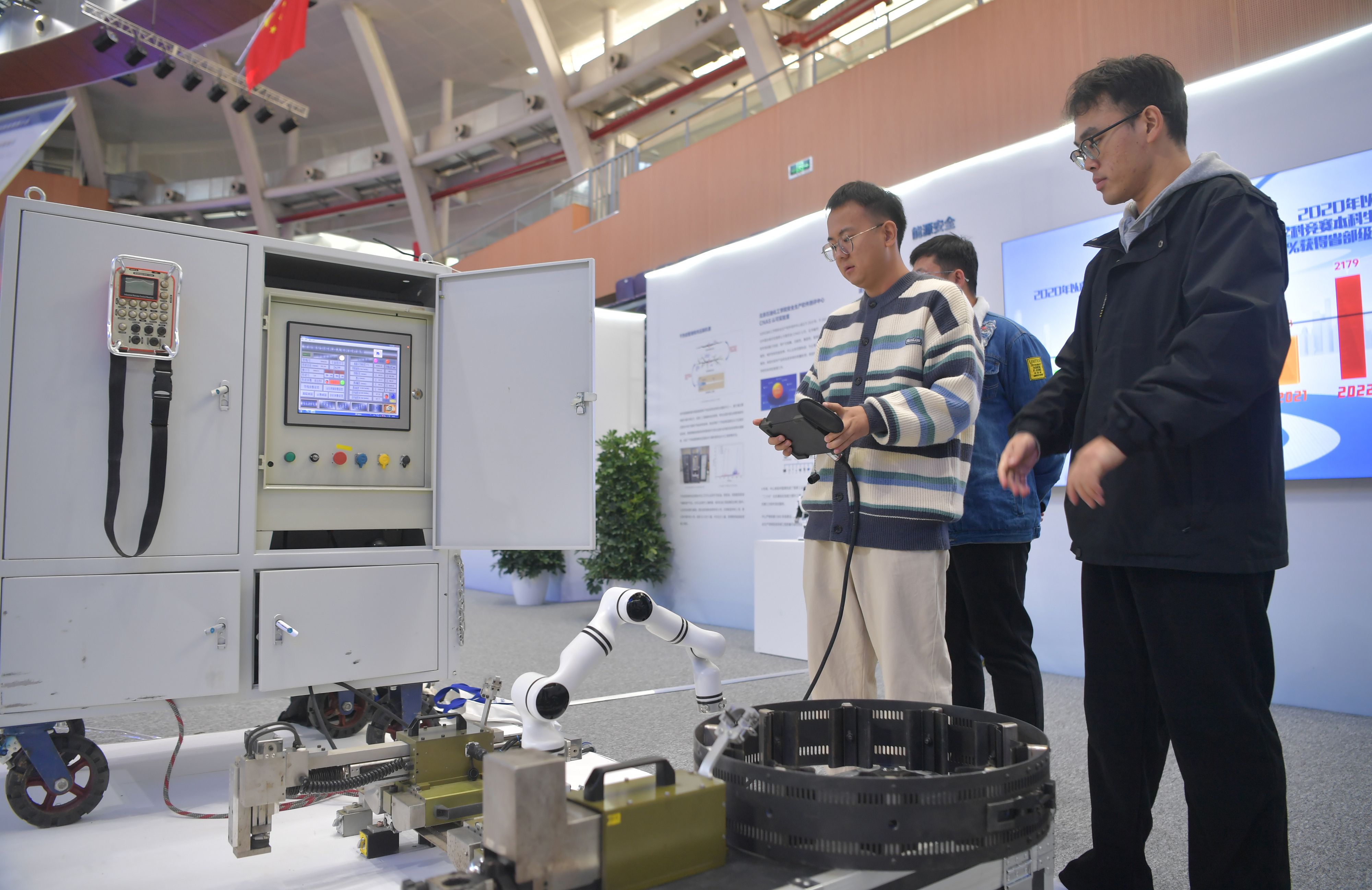 2023年,京南地區(qū)高校科技成果推介會在北京建筑大學(xué)大興校區(qū)舉行。圖為高校師生在展示管道全位置焊接機(jī)器人系統(tǒng)成果。