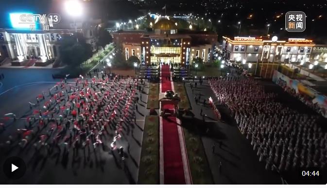 1500多名身著民族盛裝的塔吉克斯坦青年表演富有濃郁特色的中塔歌舞,揮舞中塔兩國國旗,表達(dá)對(duì)中國最尊貴客人的熱烈歡迎。