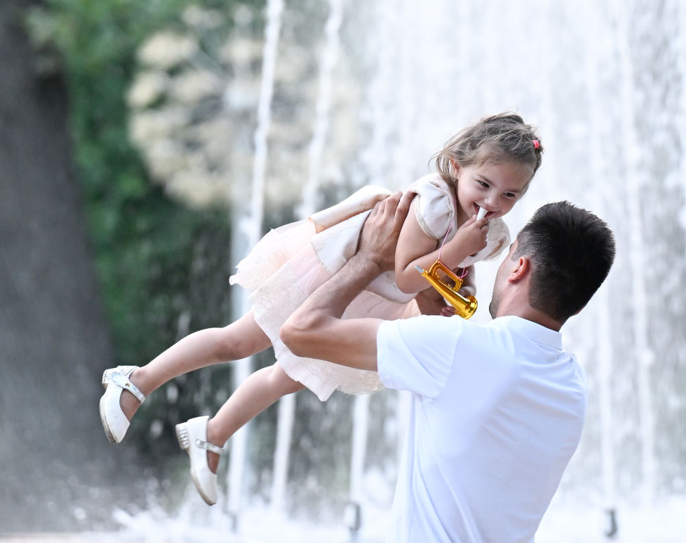6月29日,在塔吉克斯坦首都杜尚別,一名男子在魯達(dá)基公園內(nèi)與孩子玩耍。