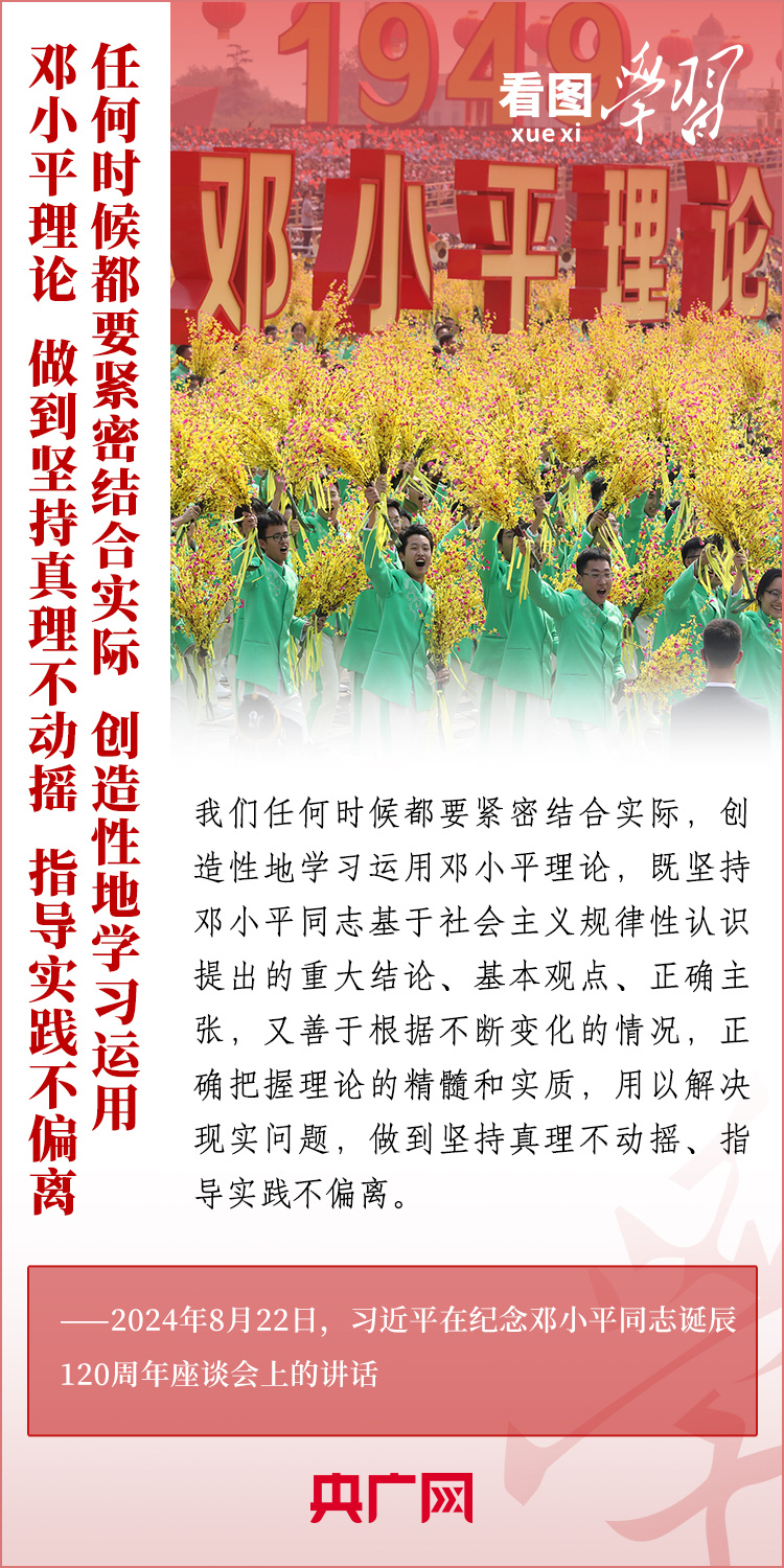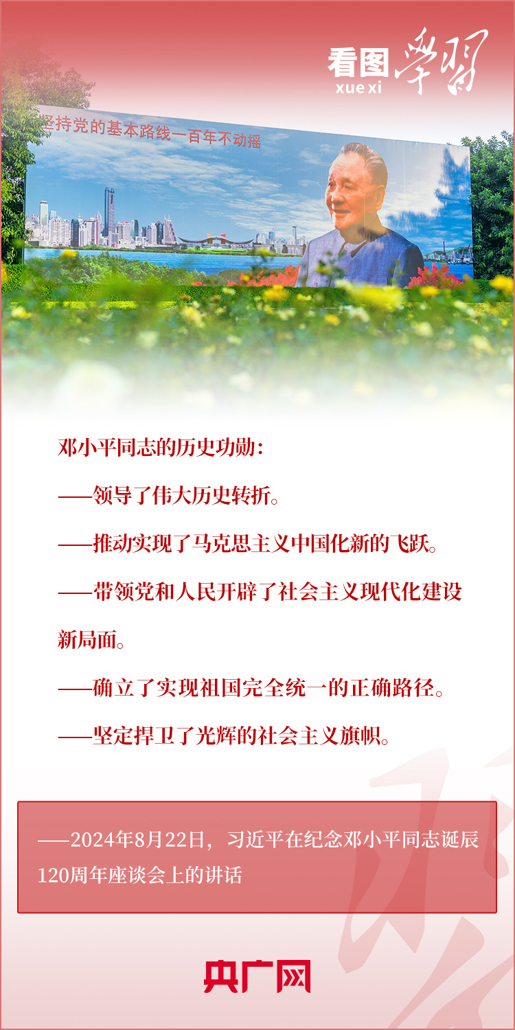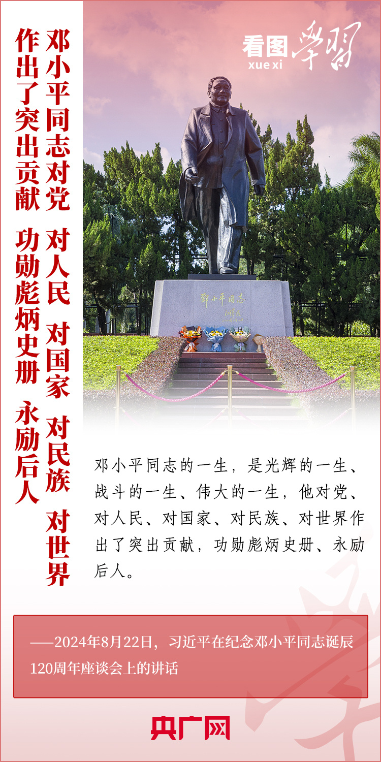 8月22日,習(xí)近平總書記在紀(jì)念鄧小平同志誕辰120周年座談會上發(fā)表重要講話指出,鄧小平同志的歷史功勛是全方位的、開創(chuàng)性的,對中國和世界的影響是深刻的、長遠(yuǎn)的。總書記強(qiáng)調(diào),對鄧小平同志最好的紀(jì)念,就是把他開創(chuàng)的中國特色社會主義事業(yè)繼續(xù)推向前進(jìn)。我們要緊緊圍繞以中國式現(xiàn)代化全面推進(jìn)強(qiáng)國建設(shè)、民族復(fù)興偉業(yè)這個中心任務(wù),繼往開來,奮發(fā)進(jìn)取。一起來學(xué)習(xí)!