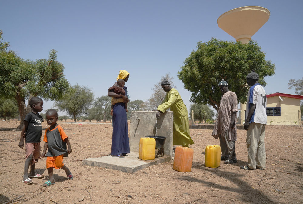 2023年3月20日,在塞內(nèi)加爾久爾貝勒區(qū)的泰內(nèi)富勒村,水井協(xié)調(diào)員馬馬杜·迪恩(右三)幫助村民取水。新華社記者 韓旭 攝