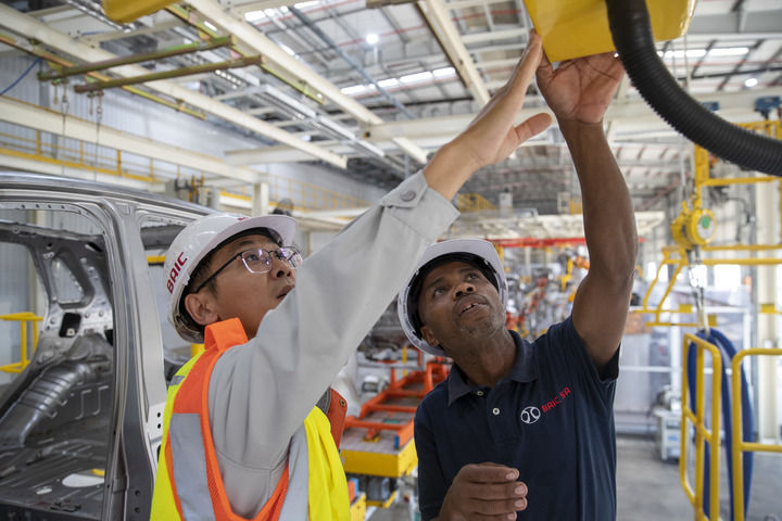 2023年5月9日,在南非東開普省北汽南非工廠,電工邦加尼(右)與中國(guó)同事方龍?jiān)诤秆b車間內(nèi)工作。新華社記者 張譽(yù)東 攝