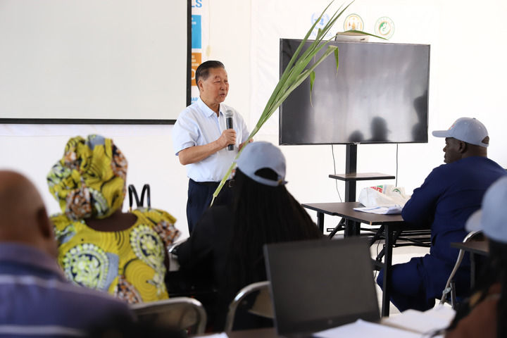 2024年8月4日,在位于盧旺達(dá)南方省胡耶區(qū)的中國(guó)援盧農(nóng)業(yè)技術(shù)示范中心,菌草發(fā)明人林占熺為培訓(xùn)班學(xué)員講解菌草技術(shù)。新華社發(fā)(黃萬晴攝)