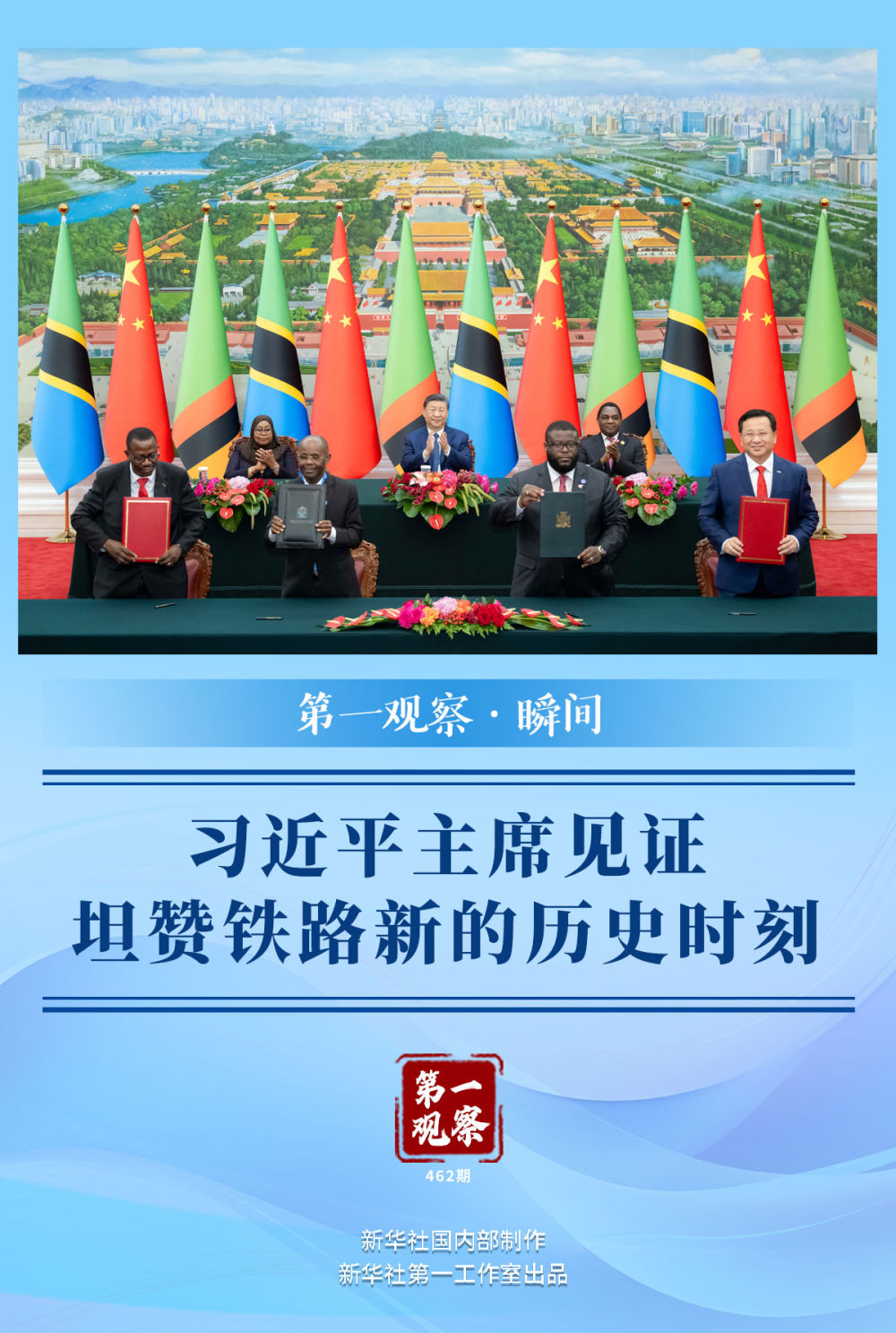 新華社記者用鏡頭記錄下又一歷史時(shí)刻——習(xí)近平主席同來(lái)華出席中非合作論壇北京峰會(huì)的坦桑尼亞總統(tǒng)哈桑、贊比亞總統(tǒng)希奇萊馬,在這里共同見(jiàn)證簽署《坦贊鐵路激活項(xiàng)目諒解備忘錄》。簽署完畢,現(xiàn)場(chǎng)熱烈的掌聲經(jīng)久不息。